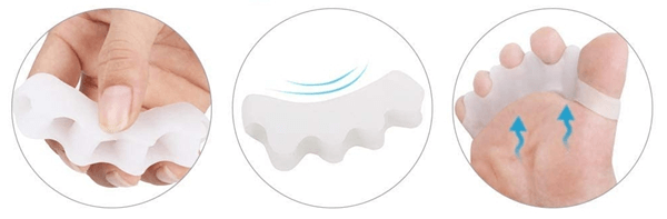 A Toe Correctort pillanatok alatt, egyszerűen felveheted: csak húzd fel egyesével a nagylábujjadtól kezdve mindegyik ujjadra a szilikongyűrűket, és a távtartó máris elkezdi jótékony hatását.